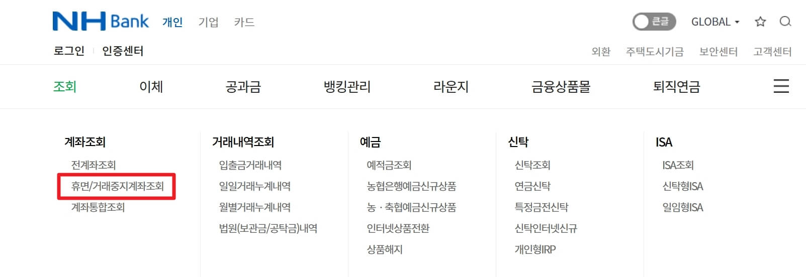 2 . 로그인 후 계좌 조회: 개인 로그인 후 '계좌관리' 메뉴에서 휴면계좌 조회