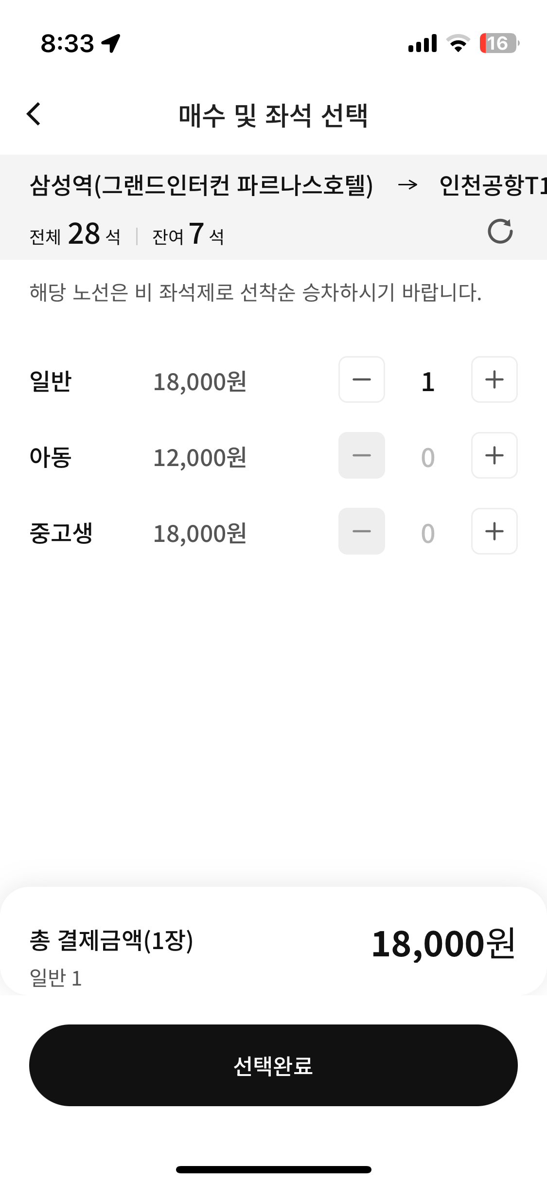 - 좌석 구분: 지정석과 자유석 구분 필수, 자유석은 선착순 탑승