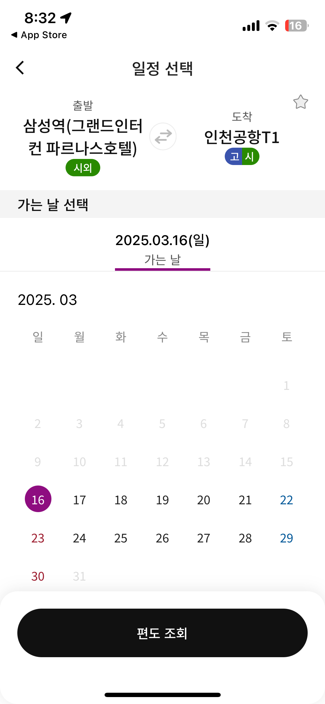 출발지와 목적지를 설정하고, 인천공항행 버스를 검색한 후 시간표와 요금을 확인합니다.